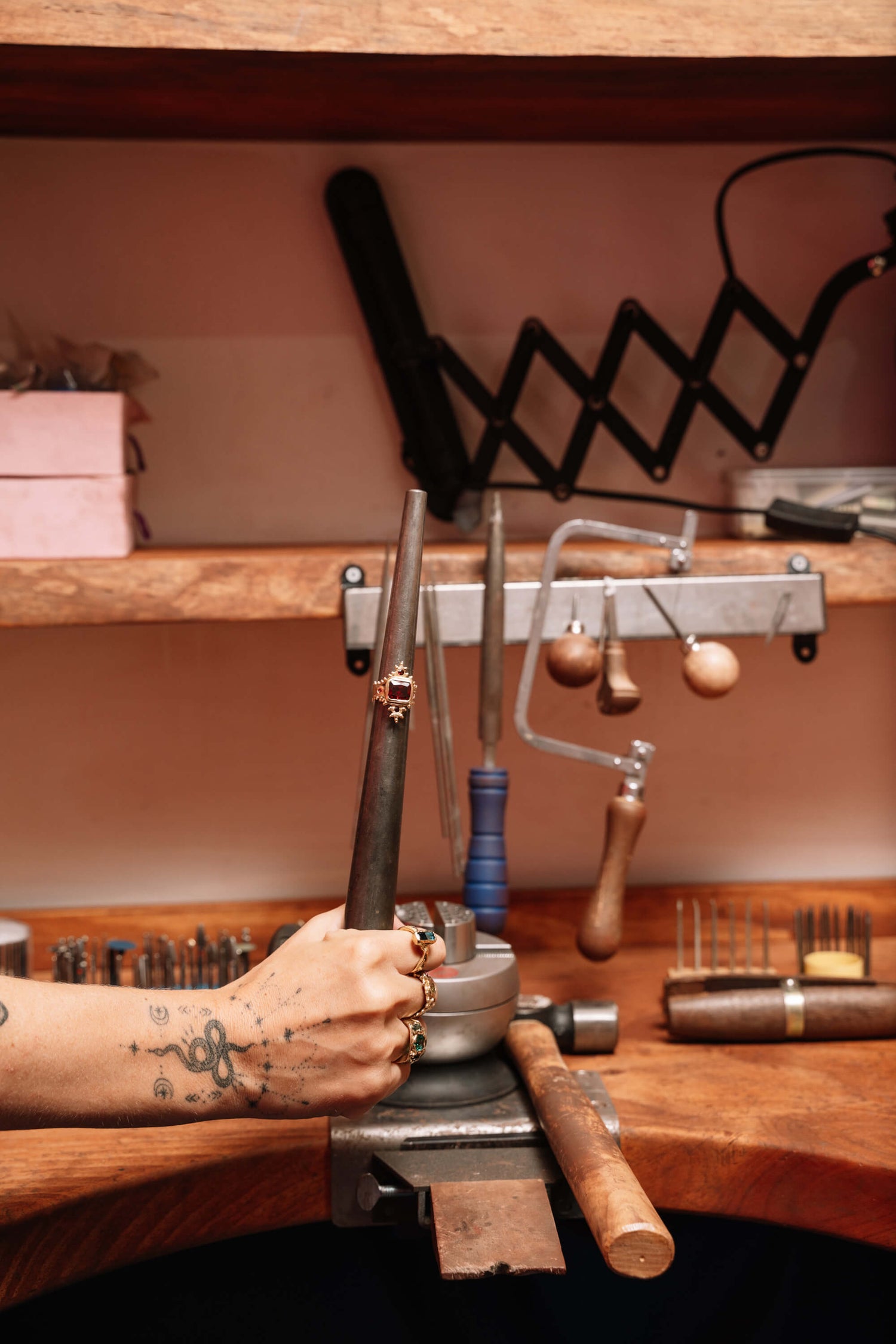 In 2020, after years of making jewellery in her bedroom, garage and converted garden sheds, Millie moved into a real studio with an adjoining shop in Brunswick. The space was a true labour of love - with friends and family chipping in to create the treasure trove of creativity and chaos, hallmarked by an unmissable pink and orange Minna Leunig mural.